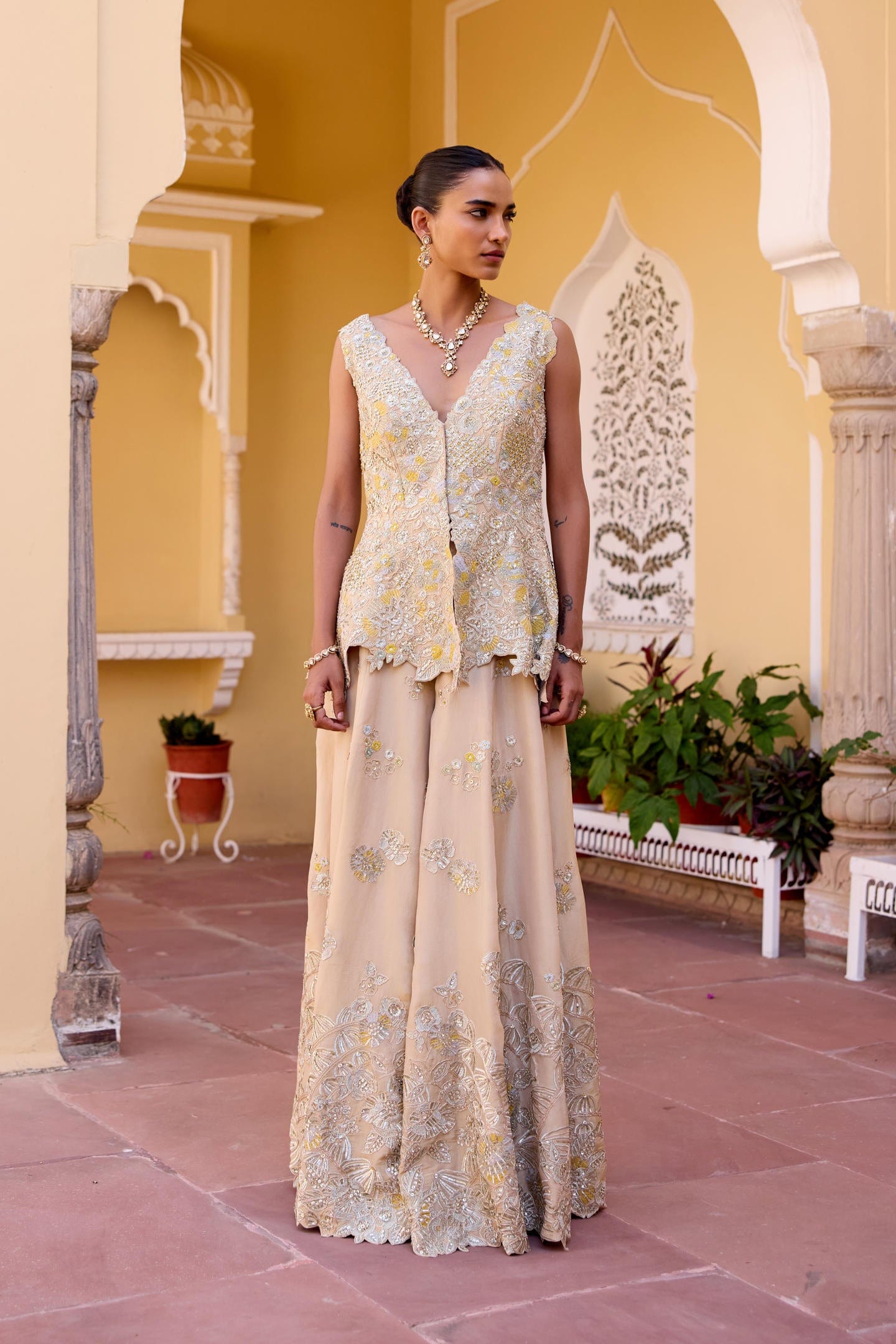 The Jacket garara set is handcrafted with zardozi, french knots, aari work and multi applique embroidery.
